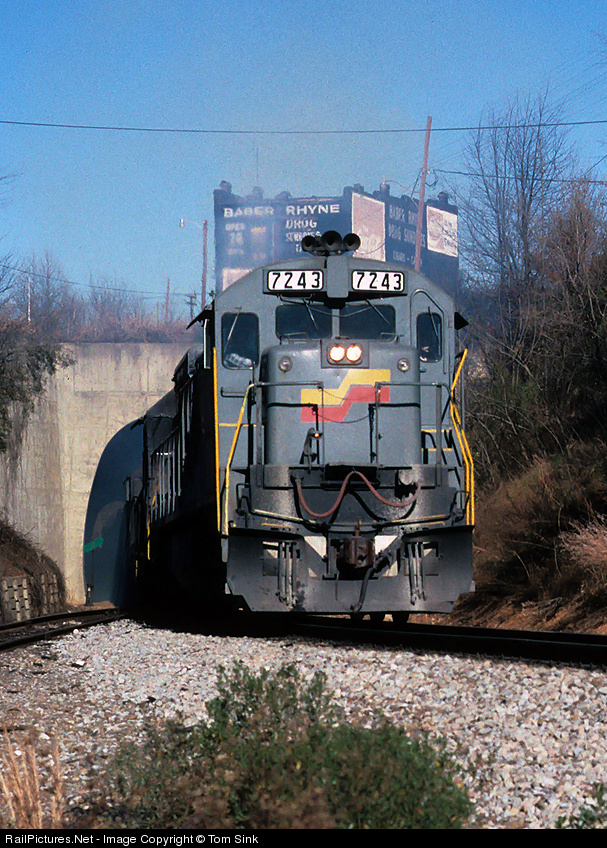 Seaboard System painted U30C #7243 leads a train out of the tunnel at Spartanburg in November 1987.
