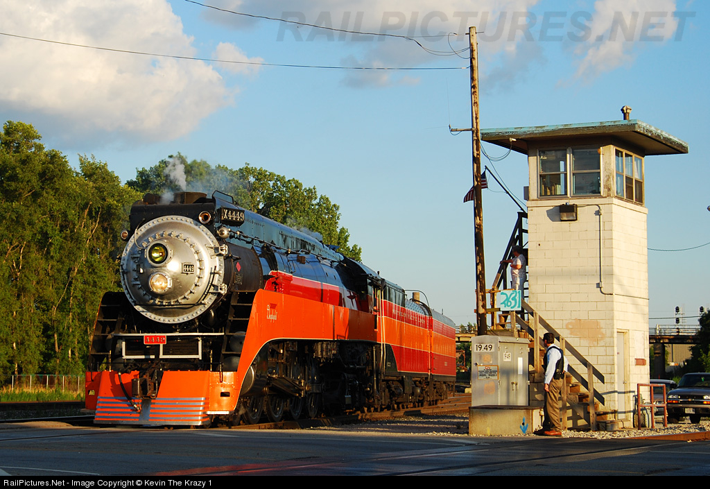 | A BIG thanks goes out to the Indiana Harbor Belt Railway for letting the SP 4449 to run on their rails on extremely short notice. After cutting away from its passenger train at CP 502, the SP 4449 ran light engine up the entire length of the IHB from East Chicago to Franklin Park in less then two hours. Here it is seen passing the GTW crossing gate tower at Blue Island. |