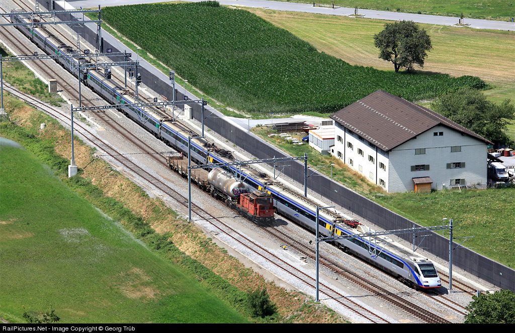 Train CIS 57, an ETR 470 tilting train from Basel via Berne-Brig-Domodossola to Milan left the Lötschberg base tunnel about one minute ago and is decelerating towards the stop in Visp, the new traffic hub of the Valais. Diesel shunter Em 3/3 of SBB Cargo, doing the local job, is waiting to cross over the tracks for serving some more loading tracks.
