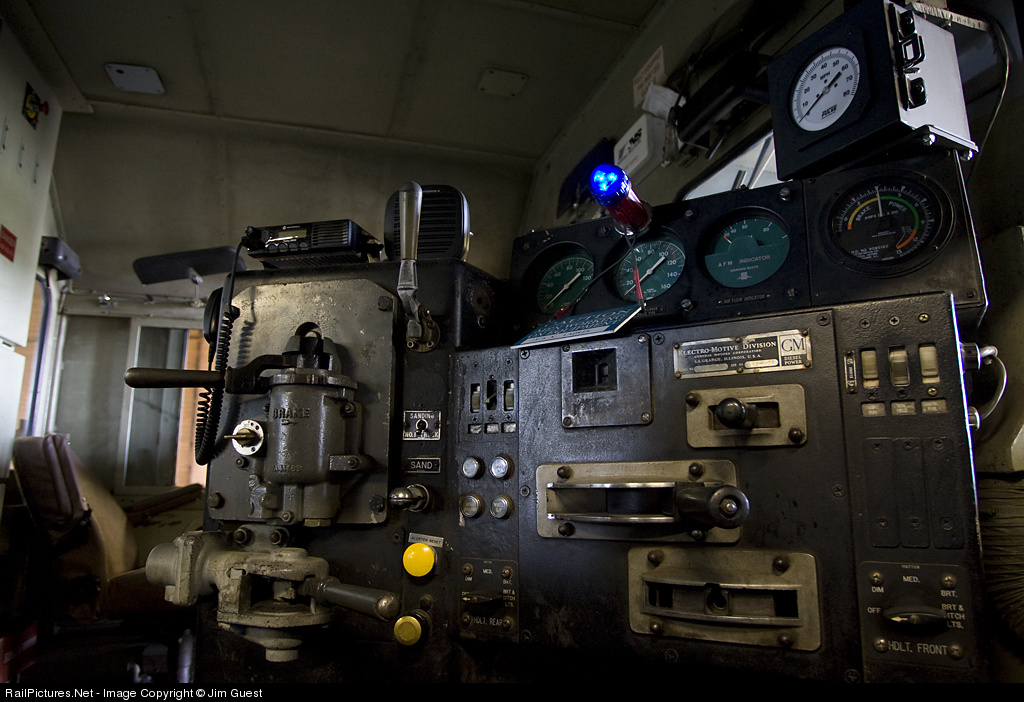 | Ever wonder what an engineer sees? Well here's the controls to an ex:TFM GP40. Viewers may notice the blue light on the locomotive, which tells employees that workers are currently working on the locomotive, and it cannot be moved. |