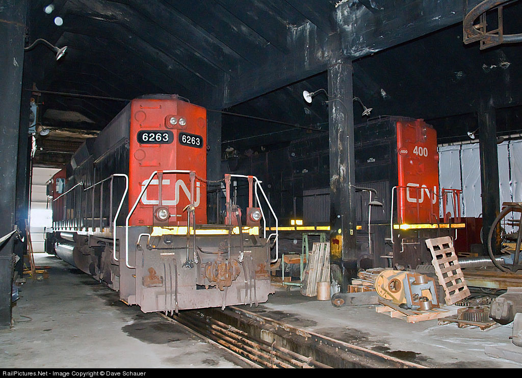 | IC 6263 and DMIR 400 are two of 14 units stored at the former DM&IR shops in Proctor, Minnesota. These roundhouse stalls saw active steam until the early 1960s. |