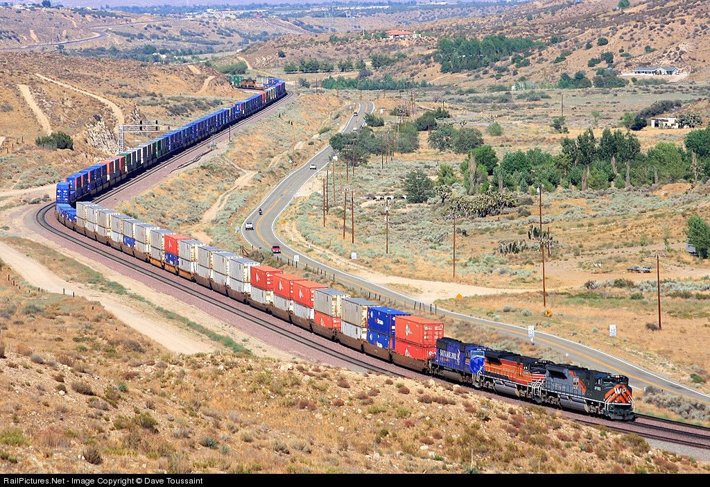| The KG1LA pulls into Cajon Pass being led by UP 1983, 1996 & 2002. Here it comes down Summit Valey just before Cajon Summit. If you look at the top of the photo you can see the mid-train DPU's coming around the corner. |