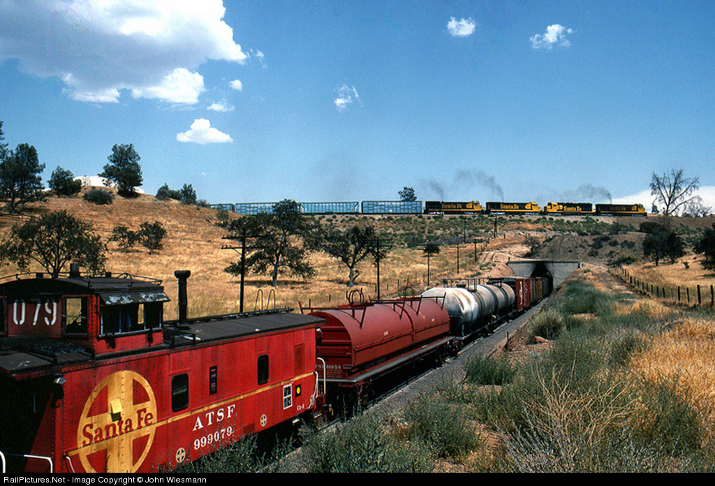 | ATSF Caboose 999079 completes a heavy freight, fighting over the Loop. Behind the caboose, an SD 45-2 (here not visible) gives some assisting power. |
