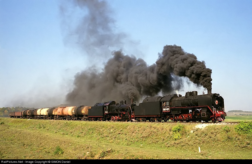 SO17 number 4371 (2-10-0) and ER 790-33 (0-10-0) are hauling an oil tanker train between Grechany and Larga. Both locomotives are oil fired.
