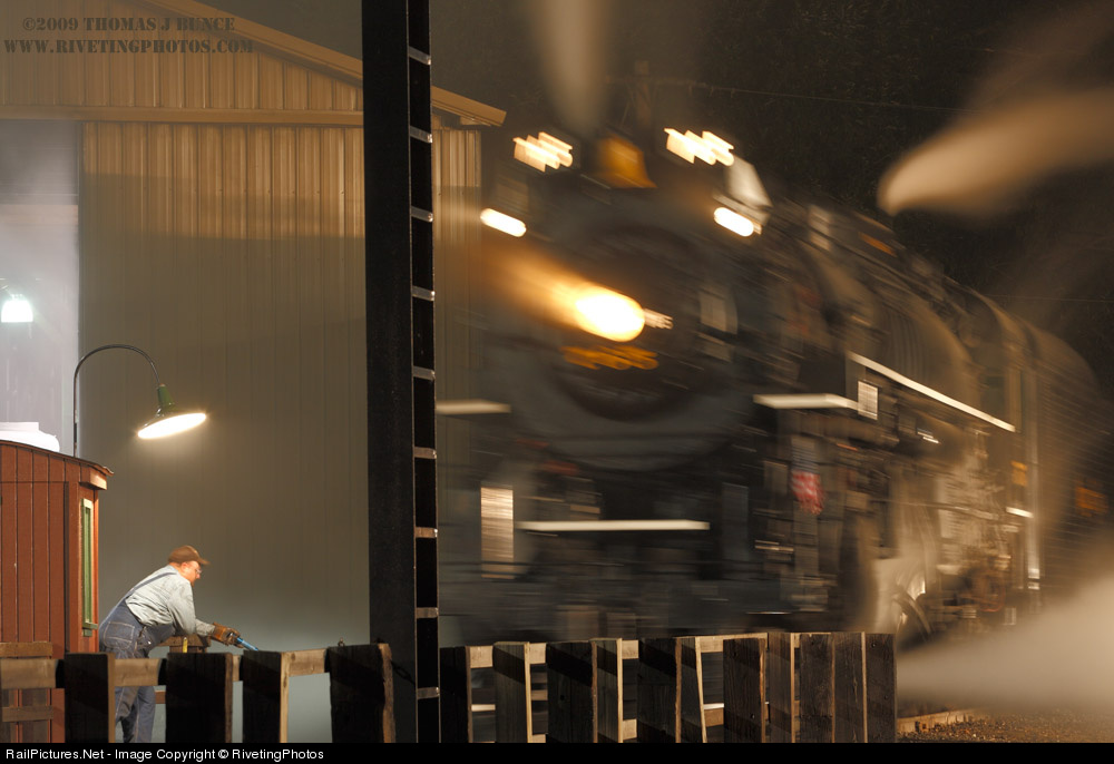 | Saturday night photo shoot at Train Festival 2009 with NKP 765 moving onto the turntable for positioning next to the other locomotives. 4 second exposure worked perfectly with the turntable operator holding nicely still while watching the wheels. Many thanks to SRI, and all the other volunteers who made this absolutely incredible experience possible! |