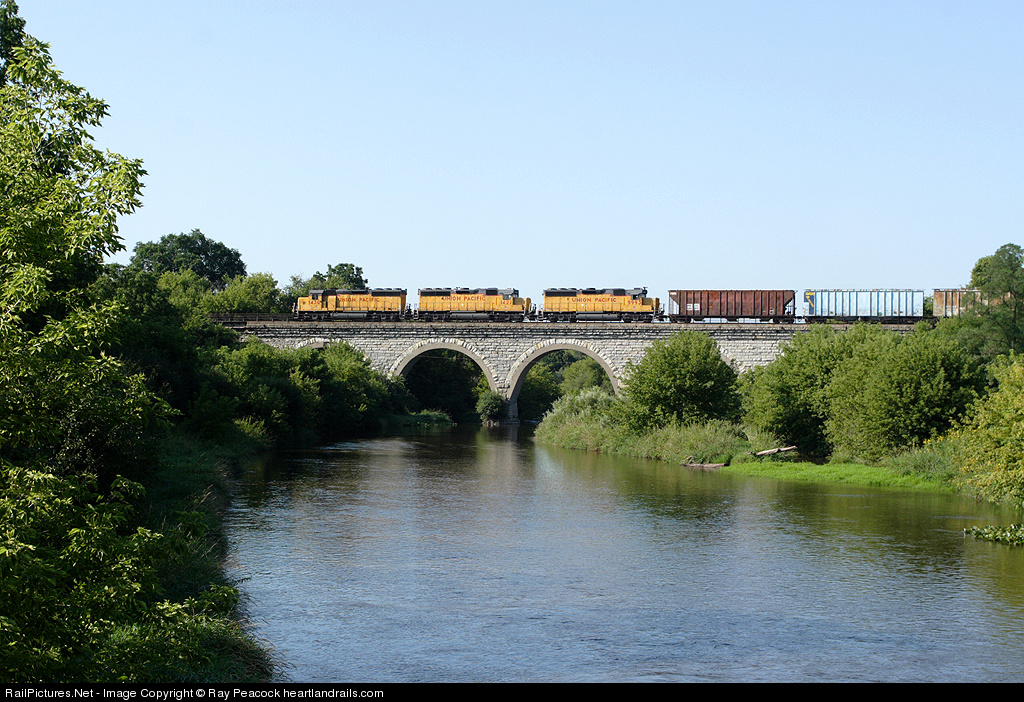 The "Lips" rolls over a swollen Turtle Creek, just out of the Janesville terminal. On this day, they are scheduled to work Clinton, WI., and then take a connection to an hour's worth of 10mph running over the ex-MILW R&SW to access South Beloit. That being a backup move, they are afforded a shoving platform in the form of an old CNW bay-window caboose, out of view here. This stone bridge features five 50-foot spans, only two are visible account of the foliage.