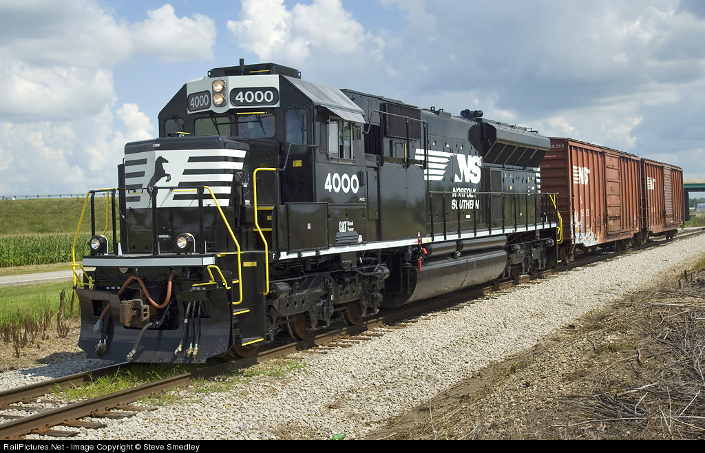 Norfolk Southern 4000, a Progress Rail PR43C that has arrrived Good Yards in Normal, Illinois on August 11, 2009, returns to the yard after working MidWest Fiber warehouse. The Caterpillar powered locomotive is scheduled to be paired with NS 4001 which has been in captive service and testing out of Normal for the last six weeks. STEVE SMEDLEY PHOTO