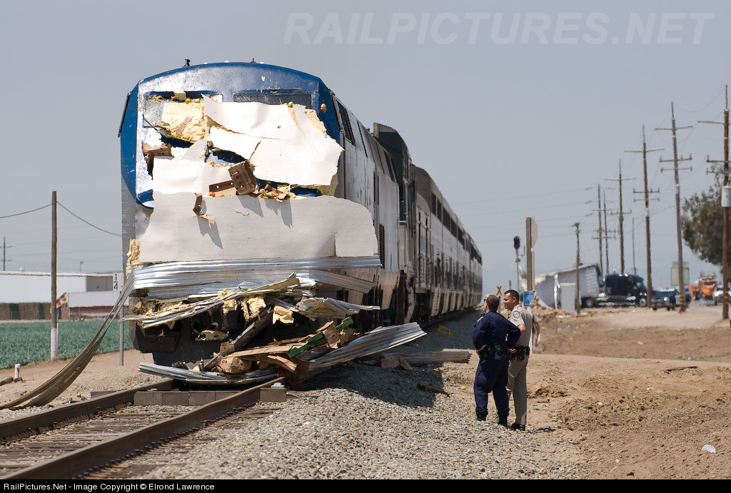 Amtrak's southbound Coast Starlight made ketchup out of a tomato truck that strayed onto an unprotected crossing in the Salinas Valley. The trailer was split in two, but thankfully the driver and his son(!) were not hurt. The truck can be seen in the distance; also note the tomato impaled by Amtrak #4's bent windshield wiper.