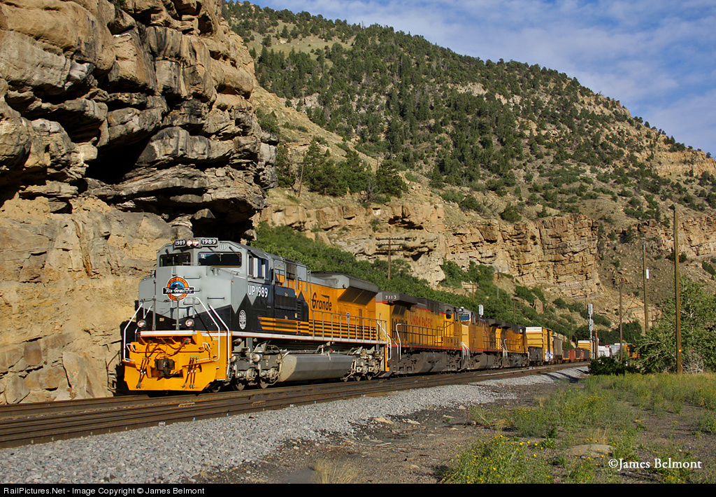 | UP 1989 leads the MNYRO-08 through Price River Canyon over the switches for the double crossovers at CP RG632, Lynn. The acoustics were marvelous here with sound bouncing off the rock outcropping amid the narrow canyon walls. I believe this move was the fifth time 1989 had covered the entire 570 mile route of the former D&RGW Denver-SLC main. |