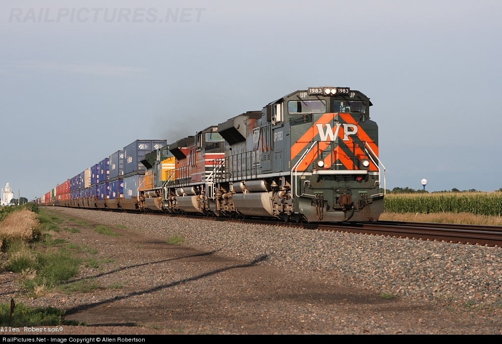 | UP 1983, 1996, and 1995 lead a westbound Global 1 to Los Angeles stack train. The train is around 12,000 feet long. |