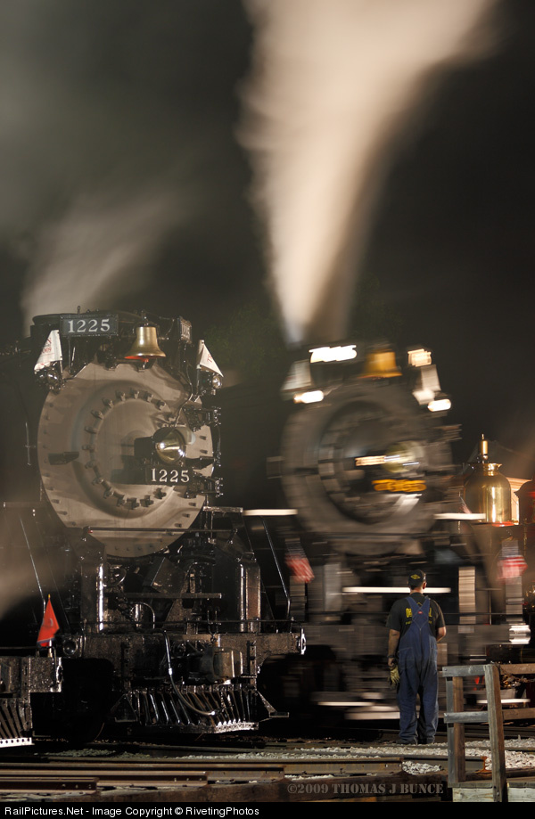 NKP 765 backs into position next to sister locomotive Pere Marquette 1225 at the start of the Saturday night photo session. Like the previously posted picture of 765 moving onto the turntable, the slow shutter speed nicely blurs the locomotive while the hostler holds nicely still.