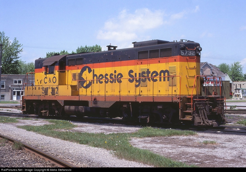 | C&O 5732, one of the Canadian Subdivision assigned units, rests by the C&O roundhouse in St. Thomas. The building to the left in front of the nose of the 5732 is the C&O office where the CTC board and dispatching for the Southern Ontario region was based. |