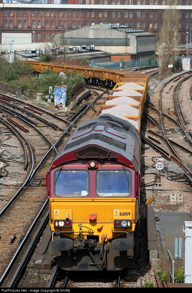 66109 hauls a ballast train through Wandsworth Road Station in South London