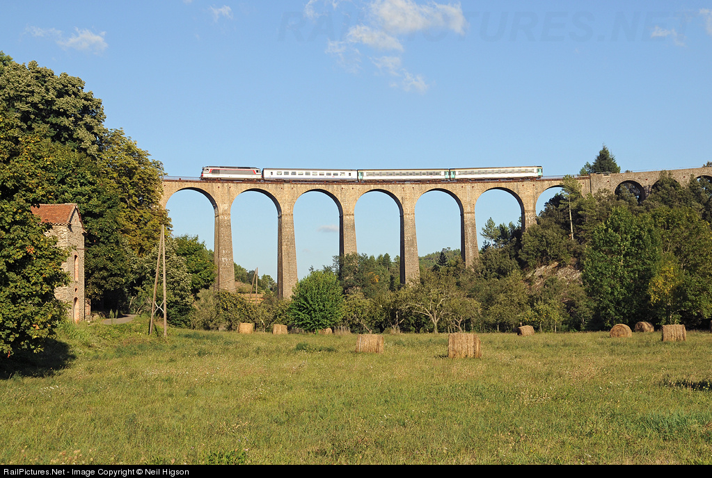 In late evening light, 67567 crosses part of the Chamborigaud viaduct north of Ales,with service RE 75564: 16:28 Montpellier to Clermont Ferrand. This stunning viaduct, designed by M. Charles Dombre, was completed in 1867 and has a total of 29 arches over 384 meters! 31.08.09