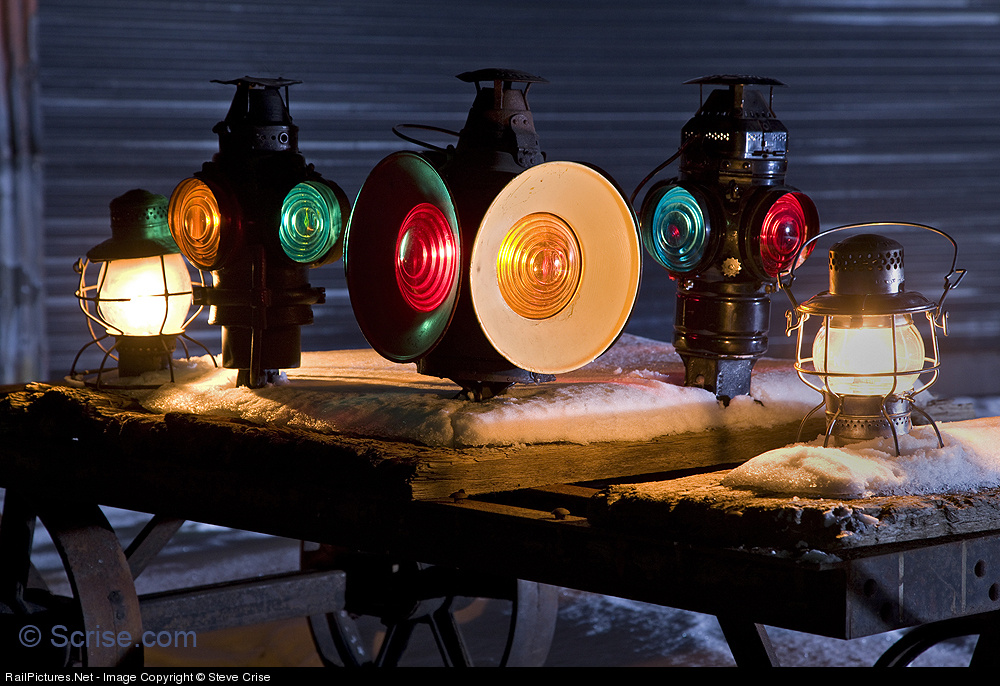 | Assembled here on an old depot cart, we have a collection of some of the lamps and lanterns that we used for the night shots. From left to right, DRG&WRR lantern made by Handlan Buck Mfg. Co of St. Louis, an Adams and Westlake (aka Adlake) fork mounted switch lamp with the kerosene tank mounted out side the body of the lamp with red and green lenses, a Dressel switch lamp showing red and yellow day targets with corresponding red and yellow lenses, and a somewhat standard Adlake post mounted switch lamp also with red and green lenses. Part of the fascination that I find so satisfying about collecting and photographing lamps and lanterns is being able to both witness and demonstrate to others the brilliant colors that their Kopp and Corning glass lenses produce while being fired by a bright orange kerosene flame. Feb. 11th, 2009