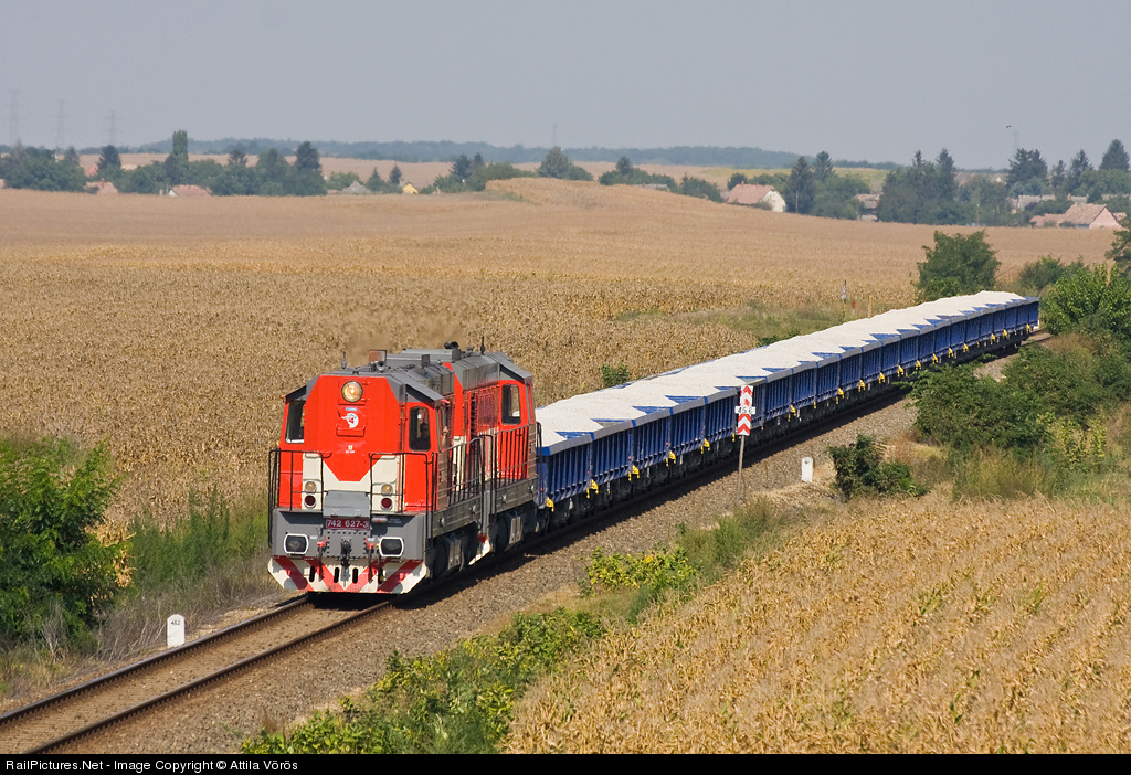 Eurocom's 742 tandem approaches to Tolna station on a ballast train.