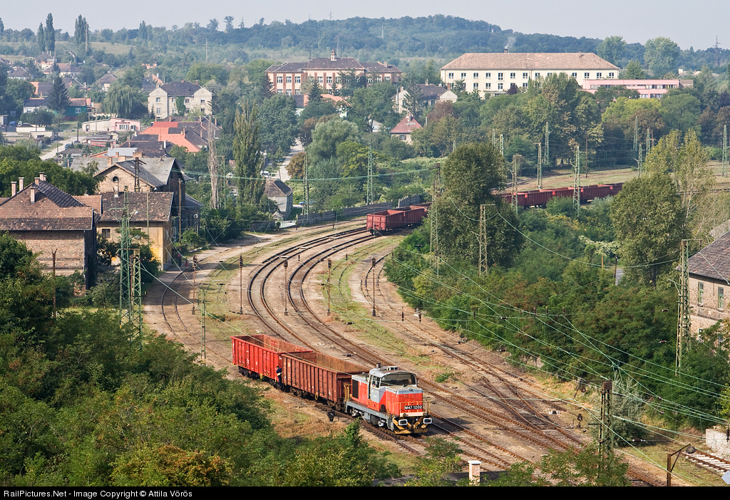 | The station of Felsőgalla is almost completely abandoned since a trace correction on the Budapest-Győr line between Tatabánya and Szárliget stations. Only a local freight train remained. On this picture the loco moves 2 carriages to an inustrial track. |
