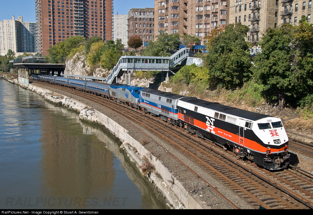| Amtrak Empire Service train 254 led by Metro-North P32AC-DM 230 & 208 and Amtrak P32AC-DM 713 SB along the Harlem River at Marble Hill detouring to Grand Central Terminal during weekend track work. |
