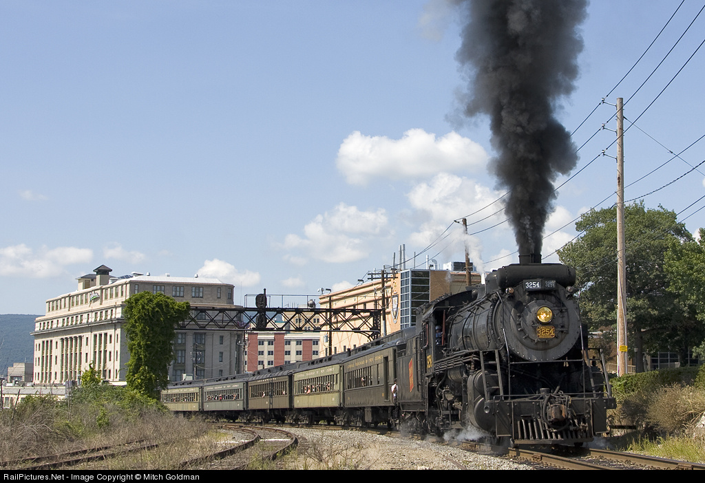 | I know what you are thinking... Amtrak during the early days when they were still using left over equipment, but, nope, you'd be wrong. Former Canadian National #3254 leads a loaded string of former Lackawanna and Central of New Jersey passenger cars on a Steamtown excursion to Moscow during Railfest 2009. Lackawanna Station |
