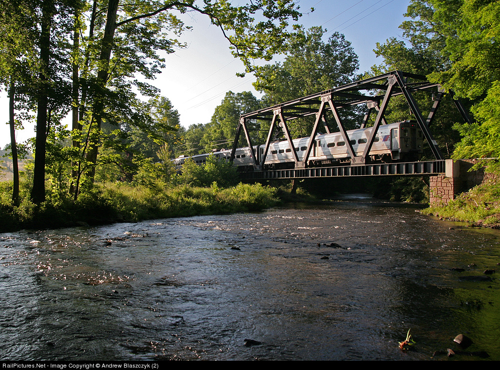 The sun has just risen over the hills of Somerset County as an eastbound MU set glides across the 'new' Hogback Bridge across the North Branch of the Raritan River.