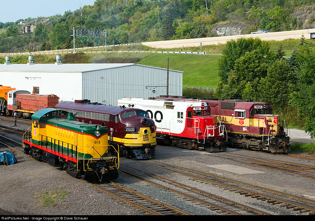 A display of locomotives that represent different railroading eras in the Upper Peninsula of Michigan. DSS&A 101, Soo FP7A 2500A, Soo GP30 700, WC SD45 7495 and Copper Range Baldwin S-12 No. 200. The WC will be repainted into its original ex-NP colors.