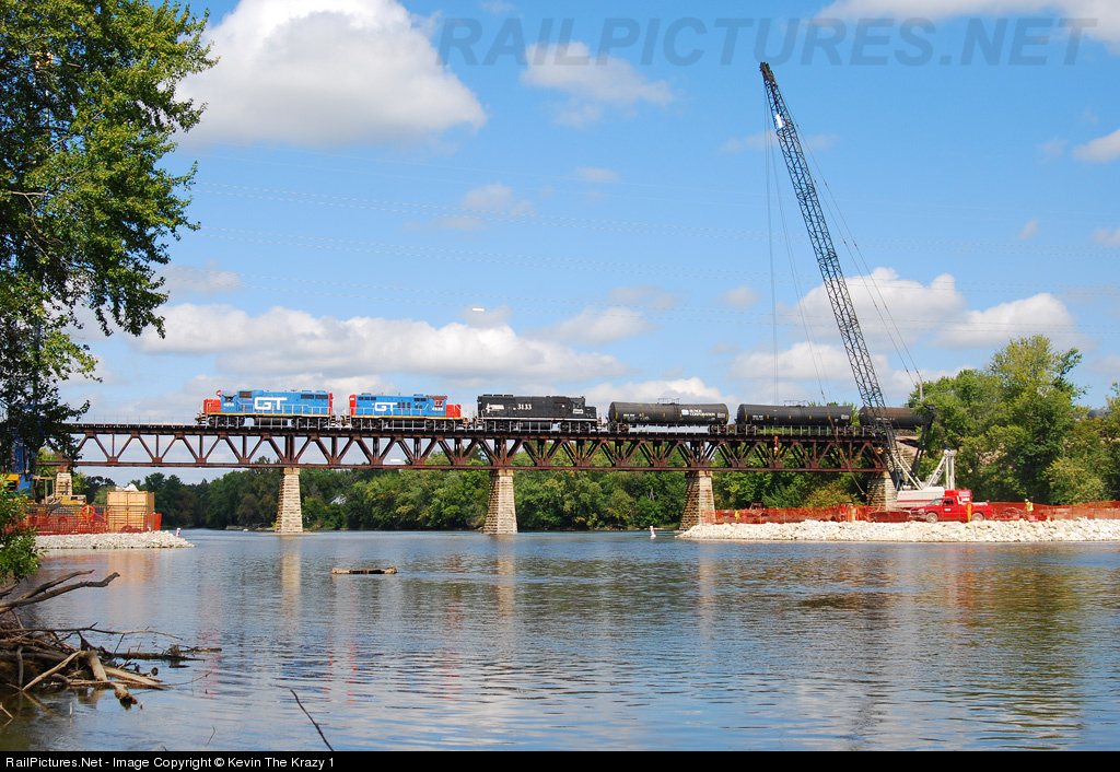 An empty ethanol races across the Fox River with an awesome GTW / IC geep consist. Sterns Road is in the process of being extended west to Route 31 which is what the construction is for in the forground.