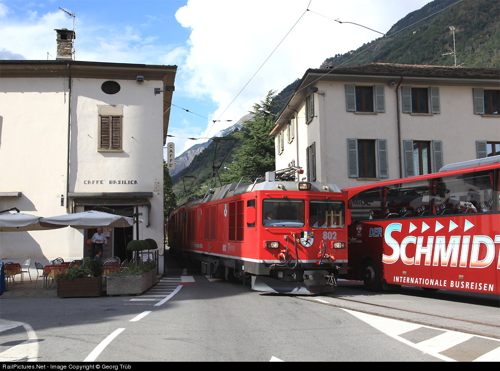 | Train 1635 of the Rhätische Bahn from St.Moritz to Tirano is entering Piazza Basilica in Tirano, while a bus failed to stop at the traffic light and has to wait now for the passing of the train. |