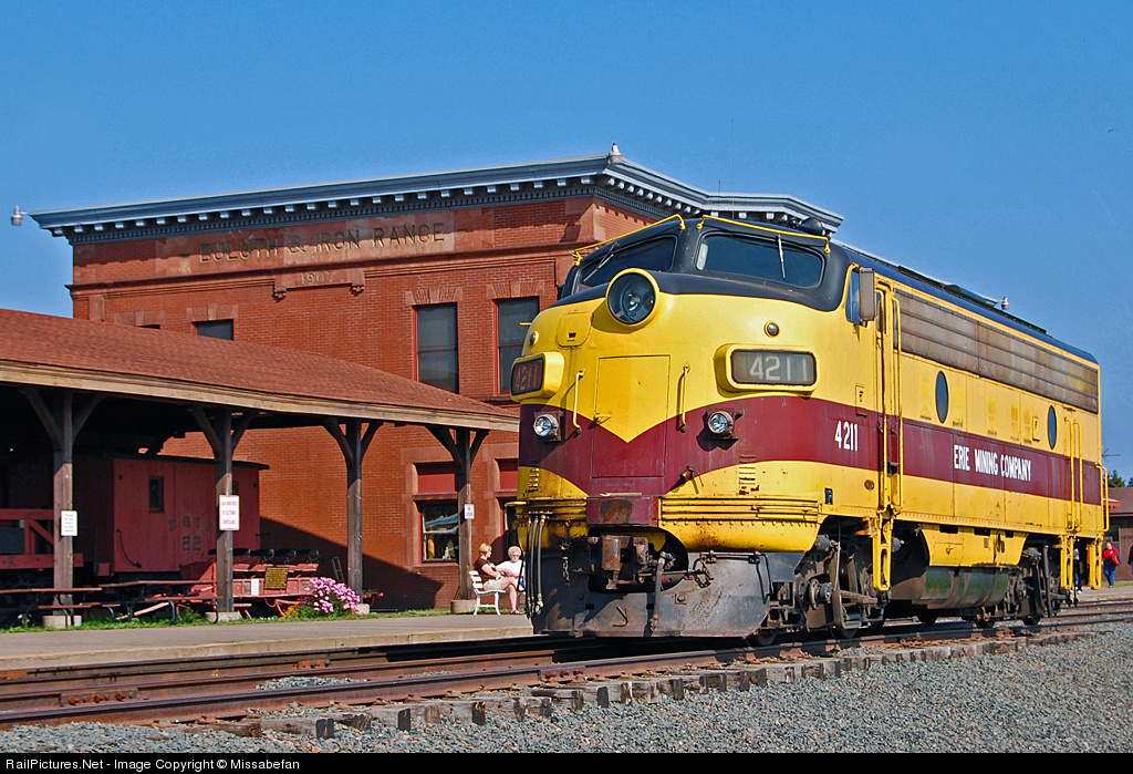 | Erie Mining Company 4211 poses in the sun in front of the Duluth and Iron Range Depot in two Harbors, MN. The big F9 now belongs to the North Shore Scenic Railroad. |