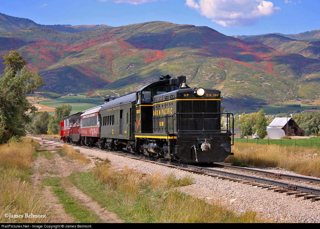 If you are familiar with the Heber Valley Railroad's former D&RGW branch in Utah, Casperville Road is an intersection where the tracks cross a rural country roadway at the top of a steep grade from Charleston. When the US government built Deer Creek Dam in the late 1930's, about nine miles of the original alignment were abandoned and relocated along the western foothills above the natural drainage of the Provo River. At Casperville Road, the line tops a grade that begins at the Provo River, eventually making a gentle left hand turn meeting the original 1899 right of way two miles southwest of Heber City. In this photo, beautifully restored UP 1011 grinds up the hill with the 'Provo Canyon Limited' on a gorgeous partly cloudy afternoon. Note the bright color along the Wasatch Mountains, and the newly applied 'switcher' paint scheme on this classic EMD NW-2. If you were to cross the range of mountains in the distance, you'd be in the Salt Lake Valley.
