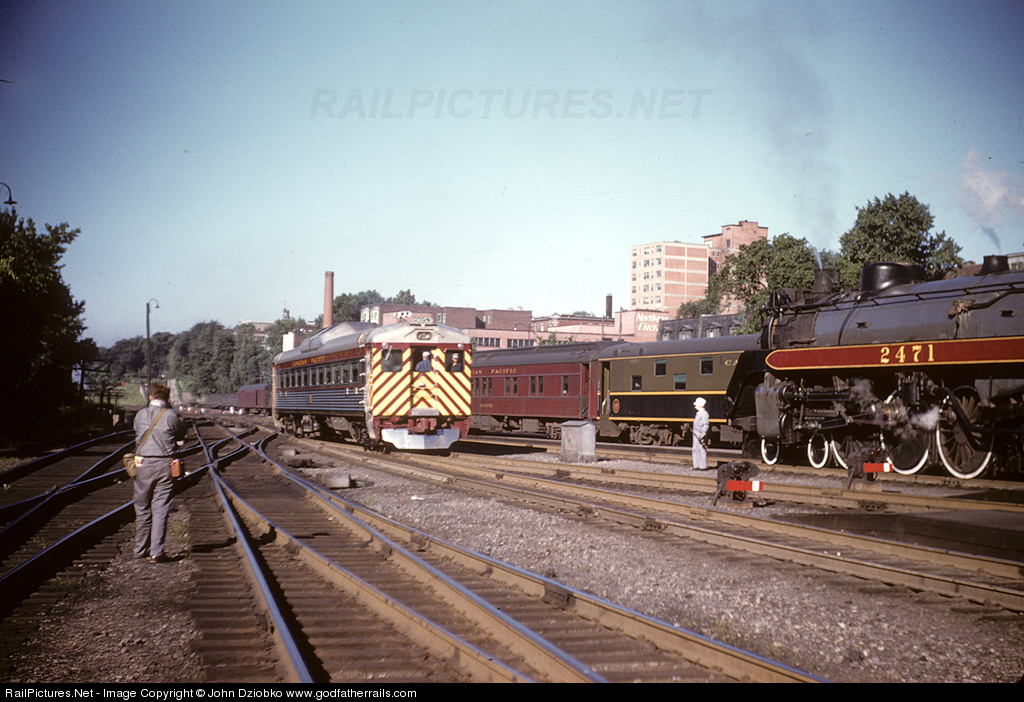 Sunday morning, July 4 1954, was alive with action at the CP terminal throat tracks including this outbound Budd RDC and 2471 crewman giving it a rollby, oilcan in hand. The man on the left is one of John's NYC railfan buddies whom he traveled with for this Canadian railfan weekend, Bill Rosenberg. Also sharing the ride was Martin Shacknee and Arnold Joseph, all mentors to the 22-year old photographer. The CN car in the CP consist in the distance over on the right is an anomaly in this otherwise pure CP scene.