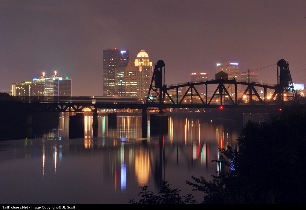 CSX Y220 starts through the lift span on Louisville & Indiana Railroad's (ex-PRR) bridge over the Ohio River. The train is heading south into Louisville after completion of their work in Indiana. It was super humid when I took this shot, and I'd like to try it again on a dry, clear night.