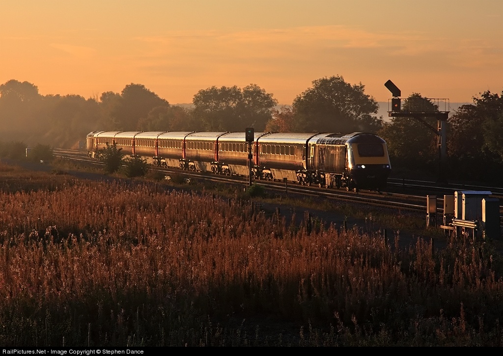 | A westbound FGW HST set passes the site of the long abandoned Moreton Sidings soon after dawn. Electrification of the Great Western Mainline may see the area of Moreton Sidings reused as an engineering base for the project. Unusually, the HST set has only 7 trailer vehicles and seems to be missing its buffet car. |