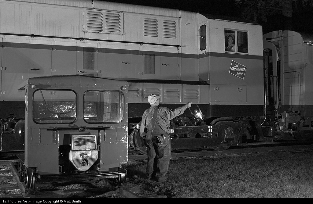 | A track maintainer gives Milwaukee Road 740 a highball as it heads from the coach yard to the station, with another passenger train. Photo from the first ever "Night Photo Shoot" at the Mad River & NKP Railroad Museum. |