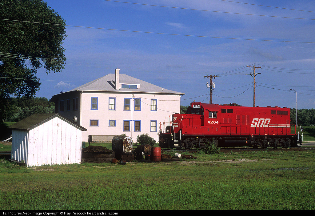 | The Soo Clinton facilities were modest, an old section house and siding sufficed. The Mississippi River levee is seen in the distance, not sure what the larger building is. The 4204 is a Conrail rebuild GP9r. |