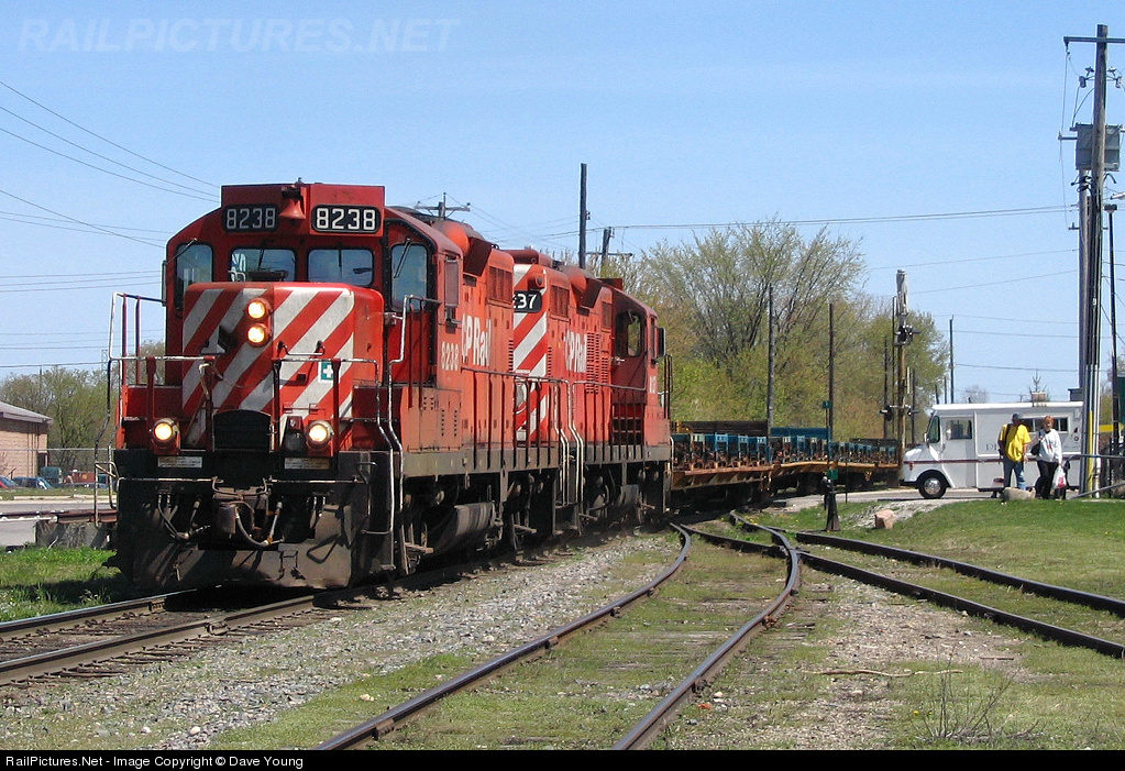 My first encounter with CP on the St Thomas sub, as the empty Frame train also known as the Sprint Train works its way down the branchline through the OSR interchange. CP 8238 and 8237 are the set on this train while another set of GP9u's accompany it's loaded counterpart, CP 142. In August 2008, this Just-On-Time train will be discontinued and pieced out on other freights to be set off in Woodstock where the yard job would take the cars down the line. Today frame cars are no longer seen on the St Thomas sub and effective December 14, 2009, CP no longer will either. Instead, Ontario Southland Railway will lease the line and take over all current operations.