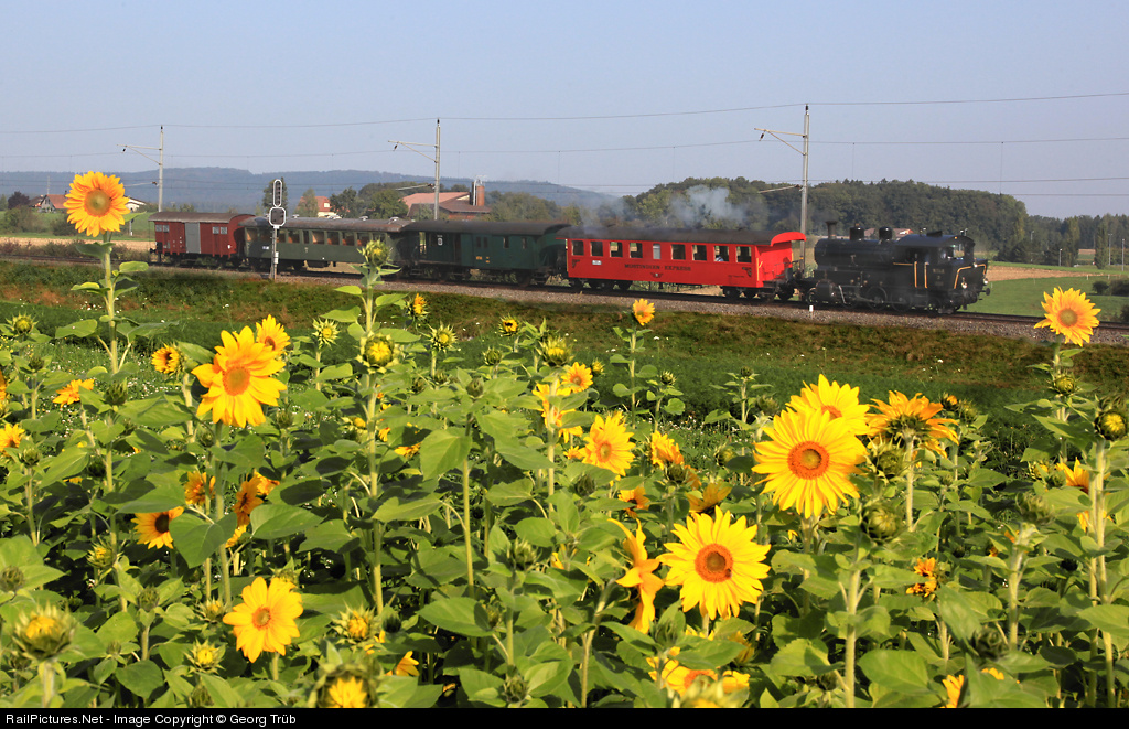 Steamtrain of Association Historic Mittel-Thurgau-Bahn (VHMThB), running for Verein zur Erhaltung der Bahnlinie Etzwilen-Singen (VES), is passing a field of sun flowers on the way to Stein am Rhein.