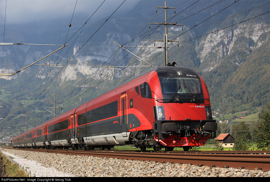 | "RailJet" trainset of Austrian Railways (OeBB) with cab car Afmpz 712 "Spirit of Innsbruck" leading and locomotive 1116 212 pushing in the back, on a driver training run in Switzerland between Ziegelbrücke and Sargans. This trains will start service between Austria and Switzerland in decembre 2009. |