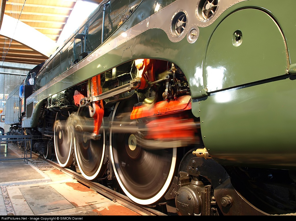 | Built in 1949, the 232U1 Hudson steam locomotive has been designed to haul express trains. At the Mulhouse railway museum, the driving axles are in motion. Synchronized sound simulate a real journey: moving off, acceleration and stop in station with brakes sounds. It sounds good but there is no smell and no steam!