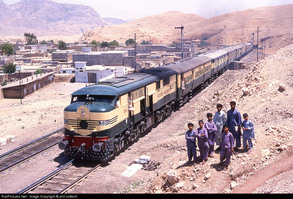Schenectady built ALCO 3815, with sister 3823 pushing at the rear, slog up the 1 in 25 (4%) grade into Mach with a train for Quetta. At Mach they will reverse into the station for a few minutes` rest before once again attacking the 4% Bolan Pass. The local kids are happy to be included in the scene.