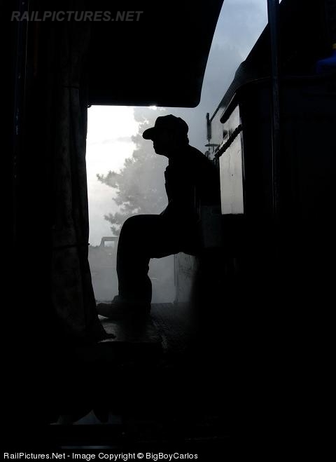 The brake man sits on the tool box inside Sumpter Valley Railway locomotive #19.