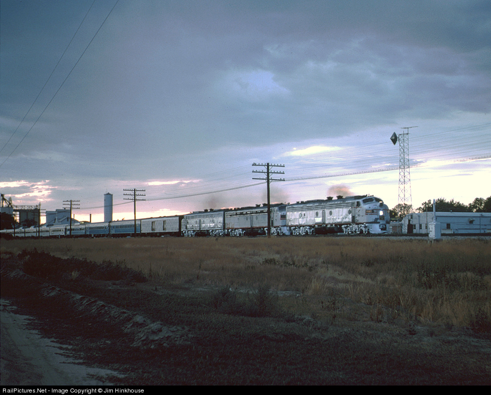 At dusk, the eastbound San Francisco Zehpyr departs from Fort Morgan, bound for Chicago, with three ex-CB&Q diesels, but a rainbow consist, including three ex-GN Sky Blues immediately behind the baggage car. Amtrak was still trying to replicate the dome service of the California Zephyr ... however, this train's dome view features the high plains of Wyoming, rather than the Rocky Mountains, as Rio Grande continued providing its own Denver-Salt Lake City service via the Rio Grande Zephyr.