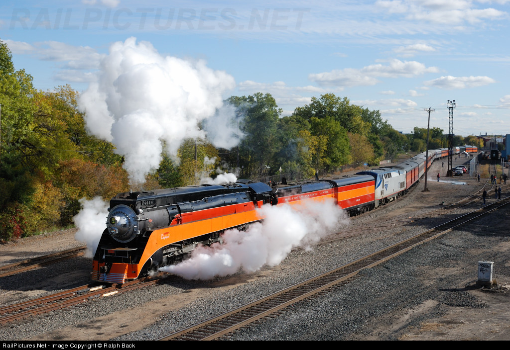 | Nice steam with cool temperatures. SP 4449 pulls west beginning its trip around the Mpls. Jct. wye to position the train for its eastbound departure to Winona along the Mississippi River on Saturday October 10th. This photo selected for the Friends of SP 4449 2012 calendar. |