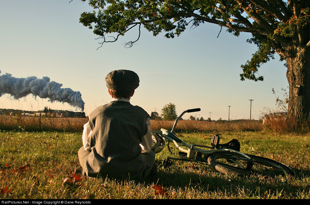 A young man takes time from a morning bike ride to enjoy the beauty of a steam powered frieght passing the family farm.