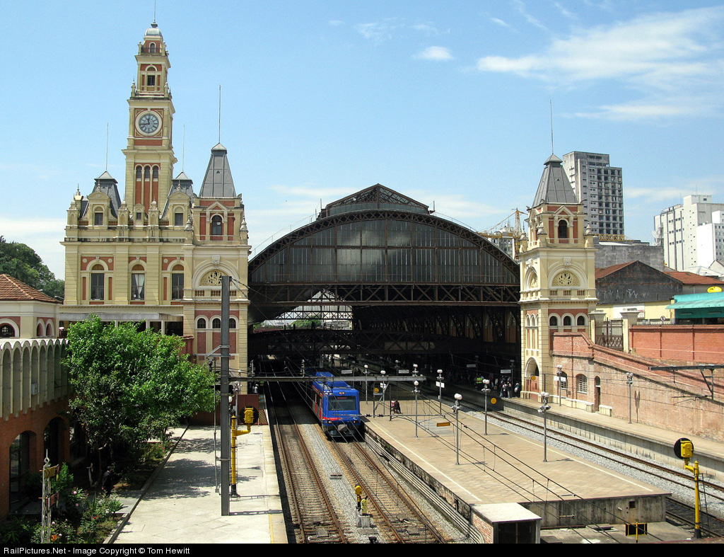 A CPTM commuter train waits to depart beautiful Luz Station on the first sunny day in week in Sao Paulo.