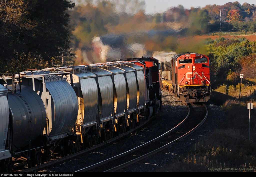 At the Newtonville S-curve, CN train 308 behind CN 8827 and 2439 meets train 373 behind IC 2720 and 5650. I set up to shoot the oncoming 308 with my 300mm, having heard him leave Oshawa over the radio, and I knew he was running wrong main via signal indication, but 373 showing up at the right time was just good luck. A busy morning, with six freights in a short timeframe; CN 107, CP 235, CP 113, CN 308, CN 373, and CN 369. Six trains but only one eastbound into the sun! 0905hrs.