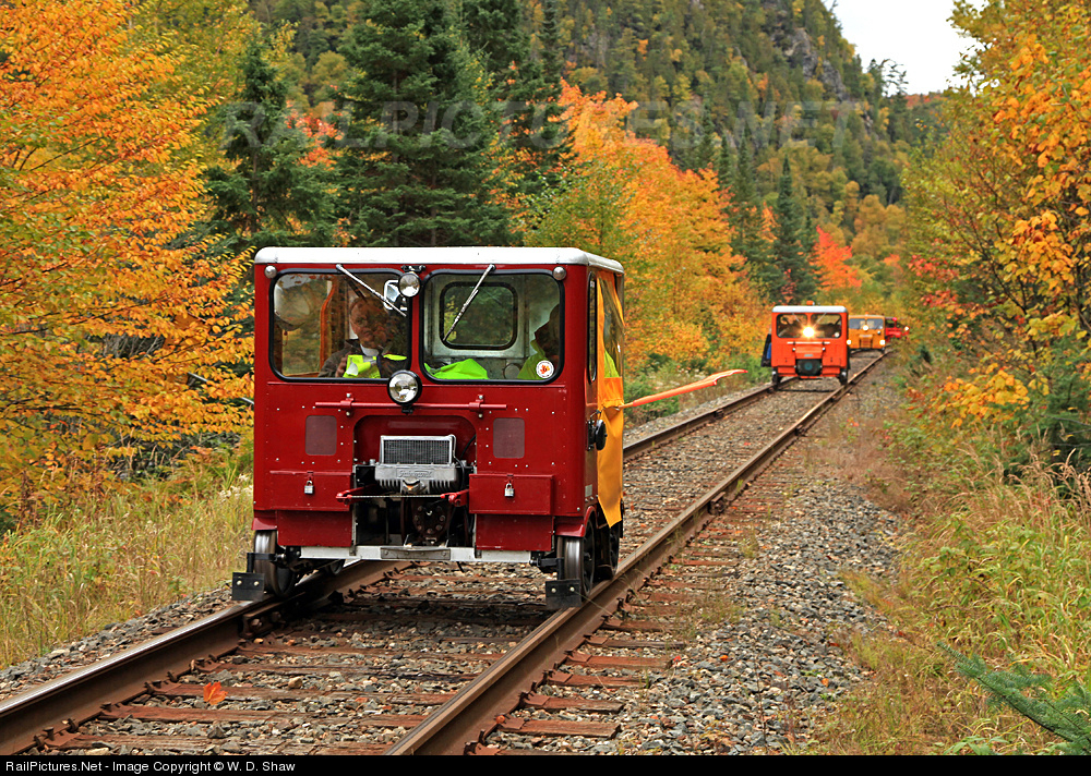 Colorful motor cars parade through a colorful landscape. Loco type correction submitted 2009-10-17, should read Fairmont Speeder. Let's see how long it takes to get done!