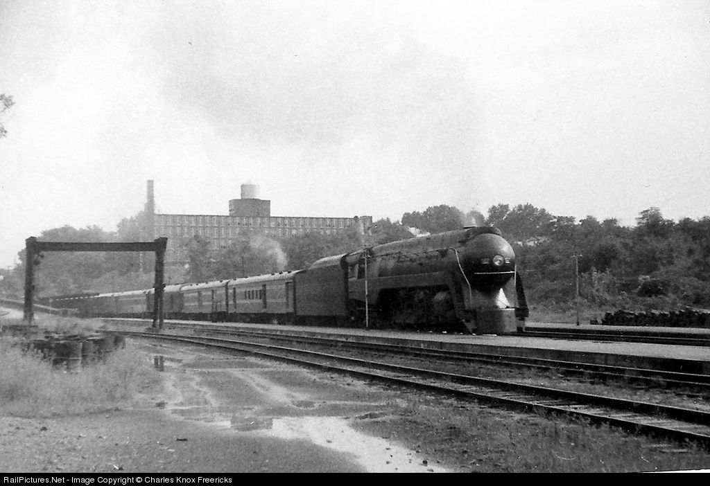 | The joint Southern/Norfolk & Western "Tennessean" heads north after its Lynchburg stop, passing in front of the lens of Charles Knox Freericks' Argus A Anistigmat. The train is being pulled by one of N&W's majestic J 4-8-4s. This was a Memphis to New York to train. To its left is a gantry crane. Above it is the Craddock-Terry Shoe Company factory. |
