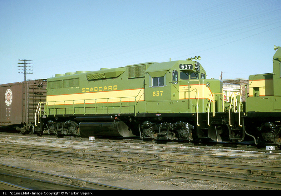 "On delivery", SAL GP40 #637 is brand new, dead-in-tow, enroute Hamlet Yard, NC from EMD to be placed in service. The GP40's were very popular with SAL crews and were quickly given the nickname "Jolly Green Giants" by the employees, referring to their bright green livery which was a major restyling for Seaboard.