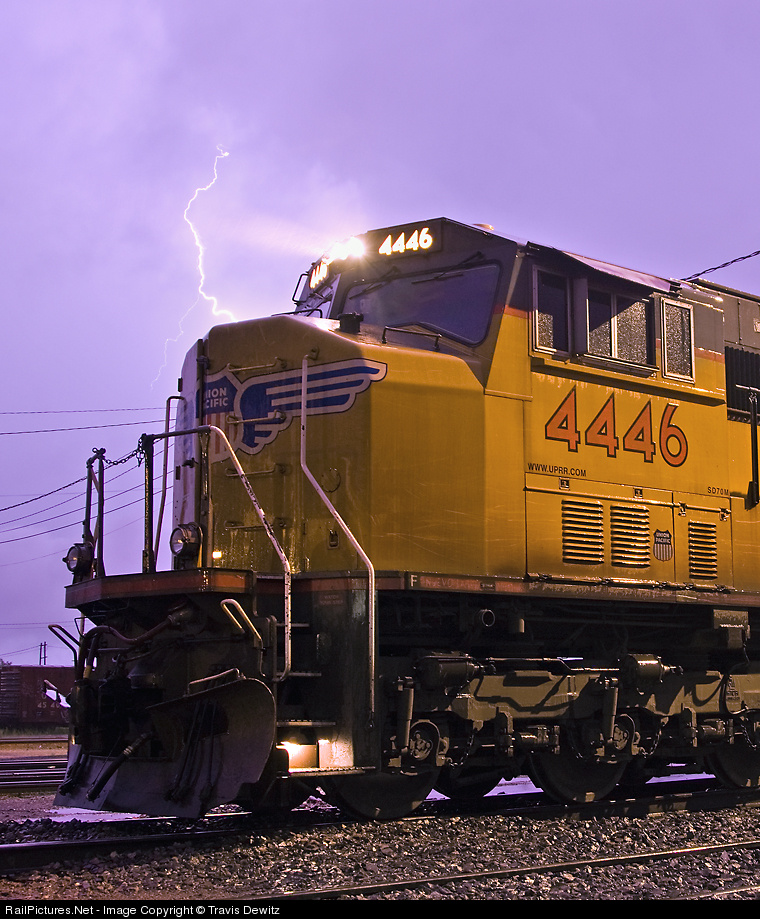 CLOSE STRIKE!! A bright bolt of lightning strikes directly behind a Union Pacific SD70-M that has just arrived with PRSS into the Altoona yard.