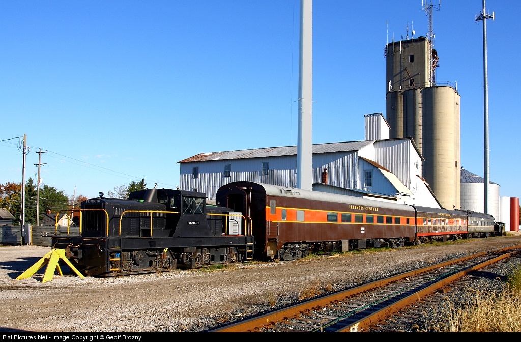 | An old Plymouth switcher sits coupled to a couple old Illinois Central passenger cars, behind the grain elevator in Delaware. |